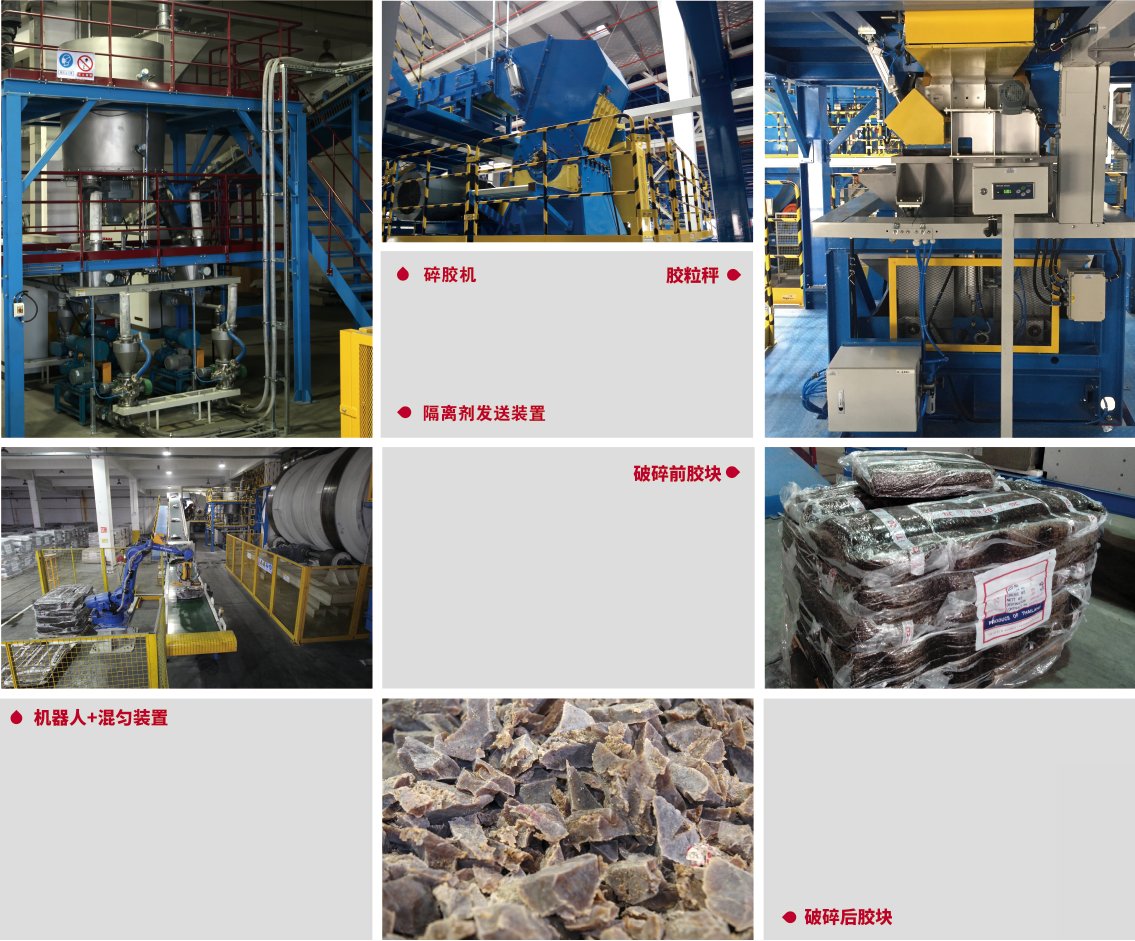 本系統(tǒng)用于將生產(chǎn)所用的標(biāo)準(zhǔn)膠塊進行破碎、混勻,從源頭保證原材料物性的均一,從而保證最終產(chǎn)品質(zhì)量的穩(wěn)定。