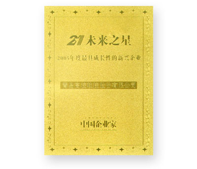 “未來之星”是中國年度最具成長力新興企業(yè)的杰出代表,《中國企業(yè)家》雜志自2001年開始推出“未來之星——最具成長性的新興企業(yè)”評選,五年來共有105家企業(yè)獲此殊榮。每屆評選出的21家“未來之星——最具成長性的中小企業(yè)”,它是從近2000家推薦的中小企業(yè)中,由知名企業(yè)、高等院校和政府等各領域的專家、教授根據(jù)企業(yè)的行業(yè)地位、成長性、創(chuàng)新性等指標評選出在各行業(yè)中最具活力的新興企業(yè),由于其評選的嚴肅性、科學性,因此在業(yè)界極具影響力。