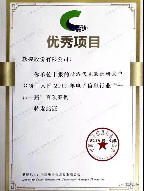 軟控股份有限公司榮獲2019電子信息行業(yè)“一帶一路”項(xiàng)目優(yōu)秀企業(yè),軟控“斯洛伐克歐洲研發(fā)中心”項(xiàng)目成功入選2019年電子信息行業(yè)“一帶一路”百項(xiàng)案例。