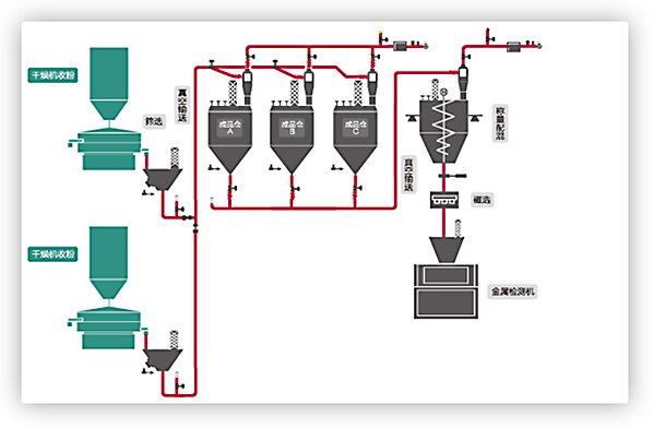 原料輸送:可實現(xiàn)大批量、遠距離、高效率輸送;快速準確的取料并輸送到指定位置;管道封閉輸送有效避免污染。